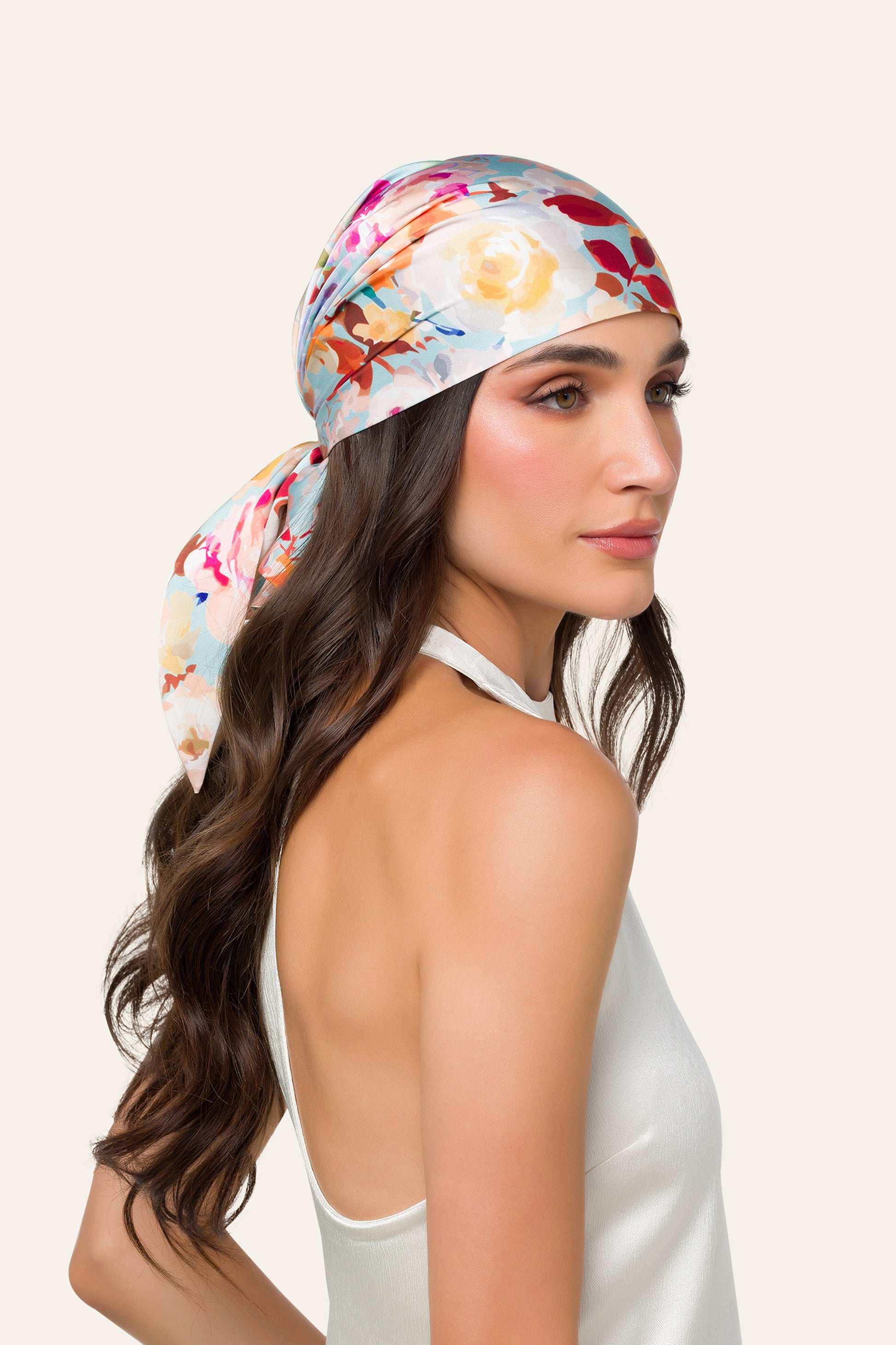 Roses are a delightful source of color, and CAMELIA is proof. Patterned with a garden's worth of freshly sprung roses, this non-slip designer bandana brings your outfit to life. It's handmade in Italy from satin for a subtle sheen and effortless drape.
