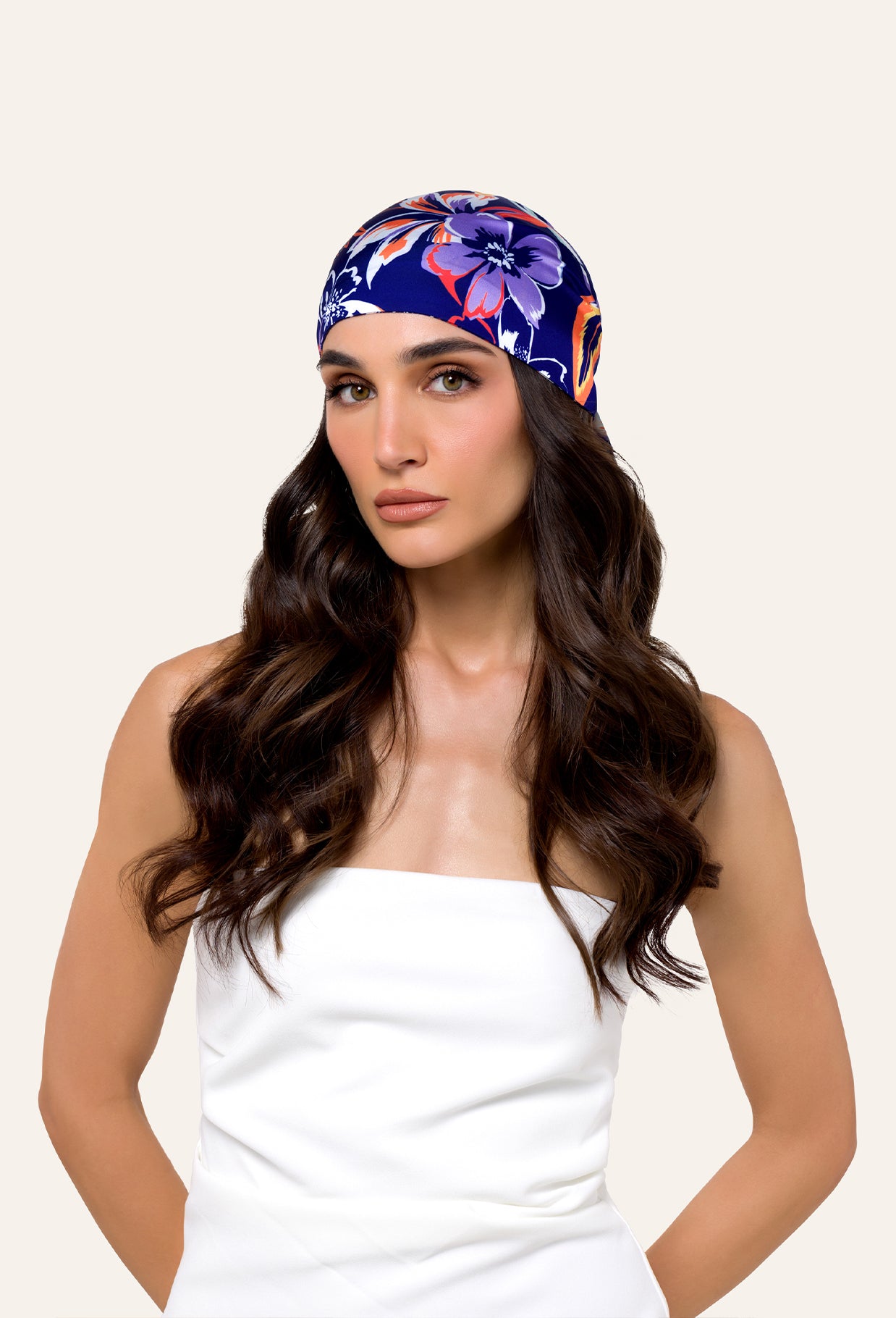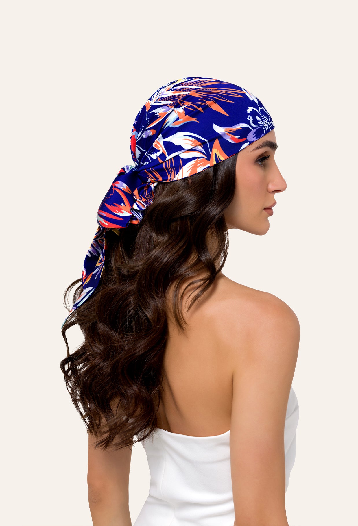 Epitome is influenced by travel, inspiring statement bandanas like EIRENE. This head scarf features vibrant tropical florals you can wear from city to coast. Cut from satin, it is smooth and easy to wear while protecting your crown.