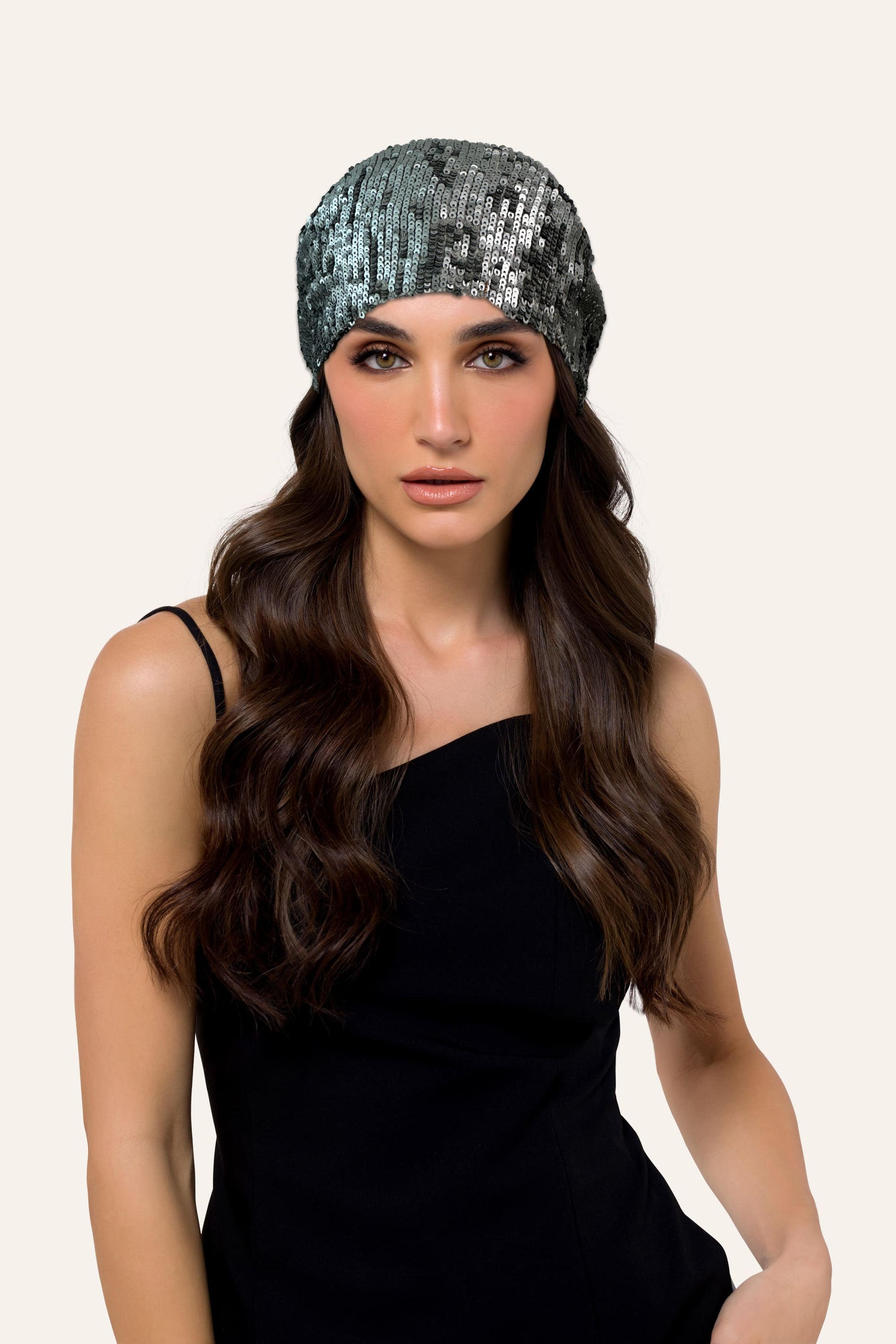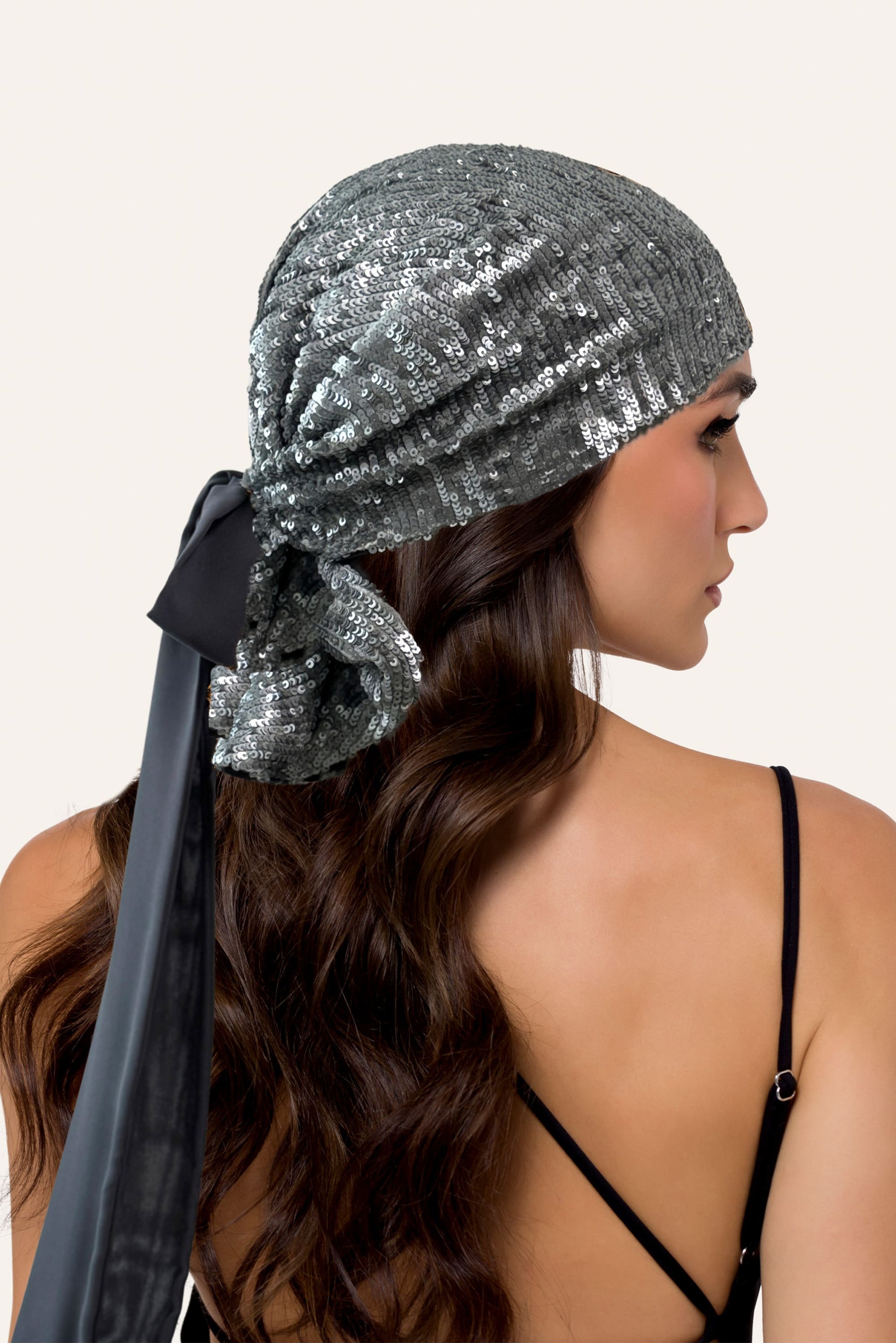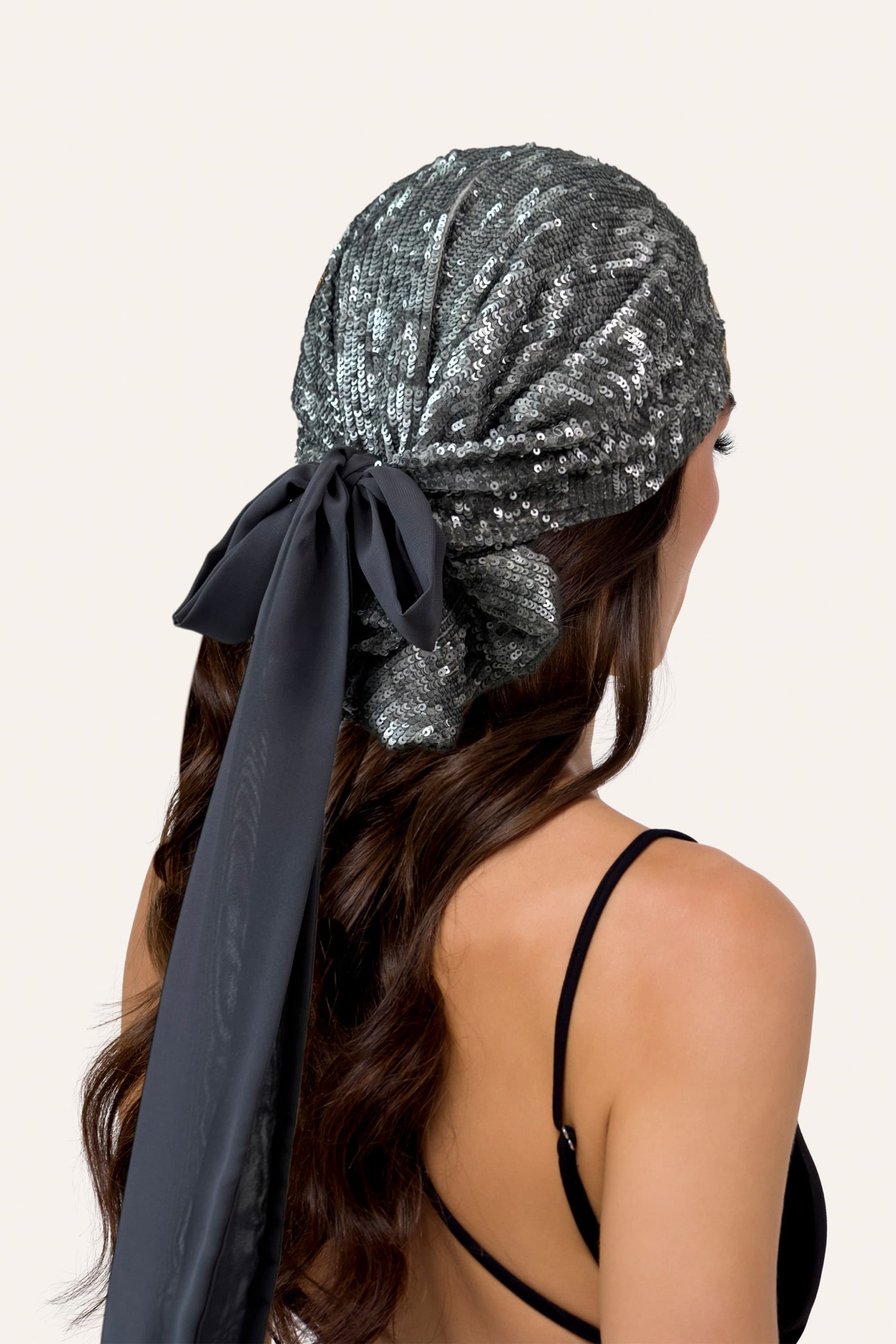 A stunning silver arc-shaped bandana covered in high-end matte paillettes for a soft, luxurious shine. The body of the bandana has a rich shimmer, while the long chiffon tails add a smooth, elegant finish and make styling easy. Designed in Epitome’s signature non-slip arc shape, this luxury hair scarf brings a refined, modern sparkle to any look—perfect for evenings, events, and standout moments.
