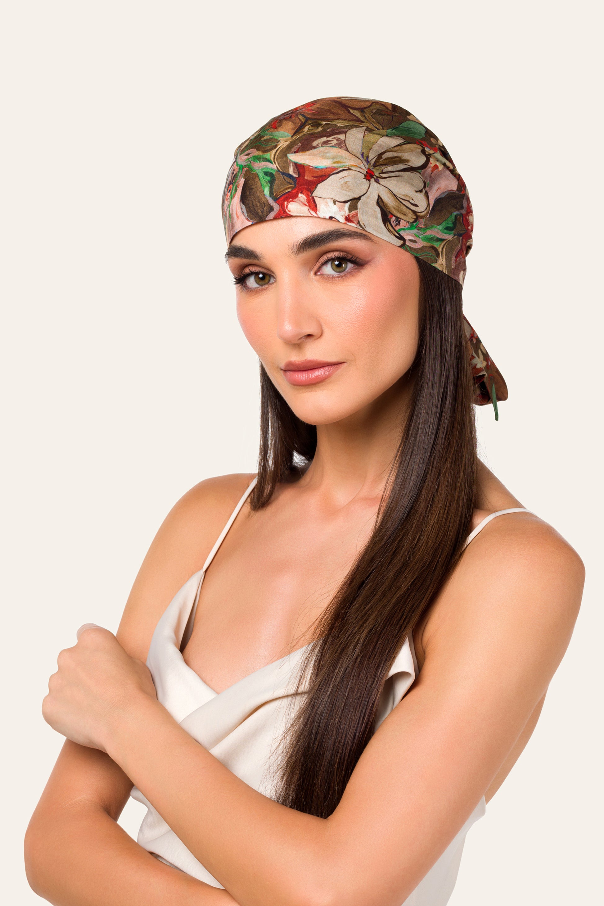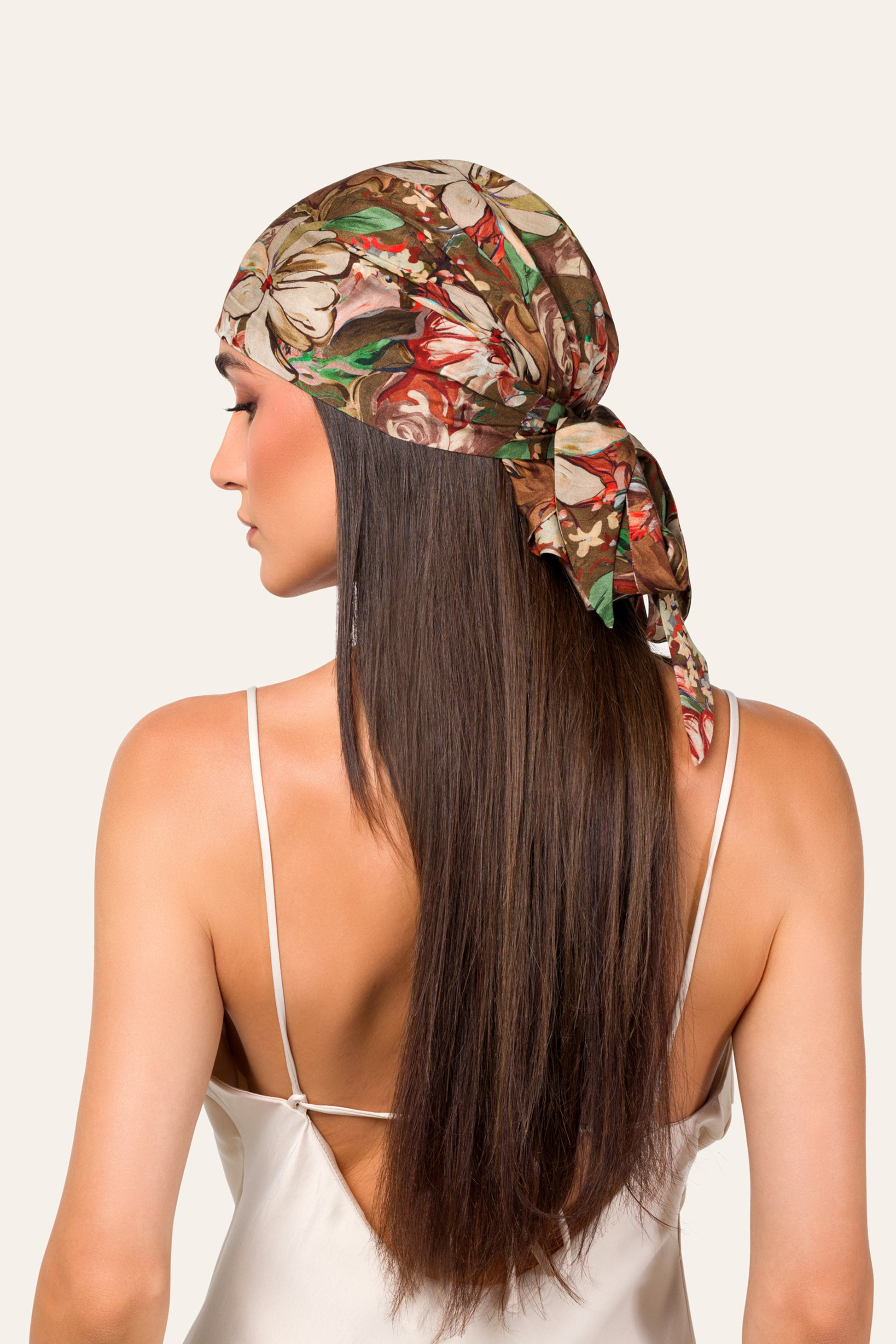 Evoking a romantic-bohemian feel, the HAZEL bandana features a painterly bouquet of lush florals that becomes more beautiful up close. It's designed to be non-slip and made in Italy from light viscose for a breathable, comfortable feel.