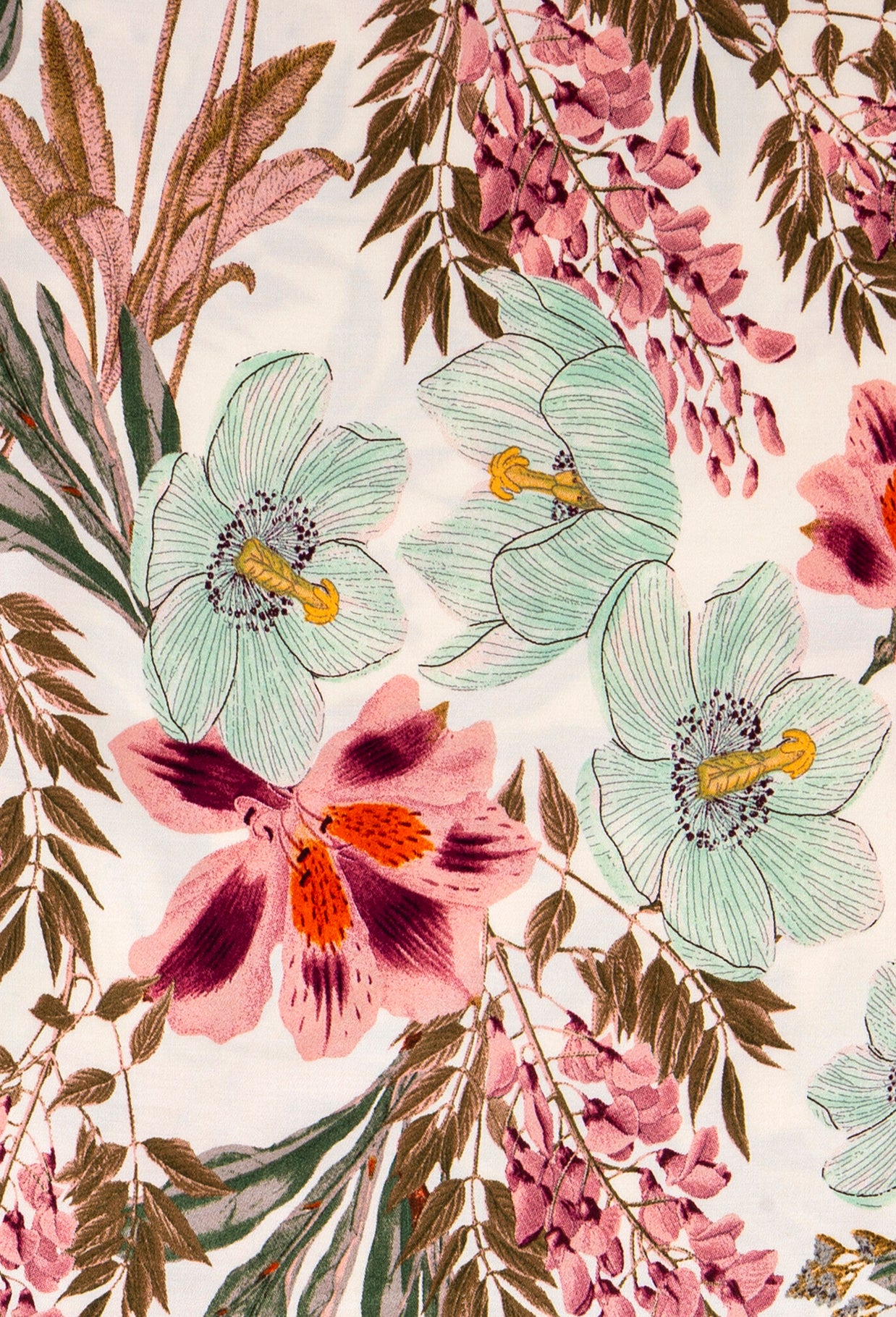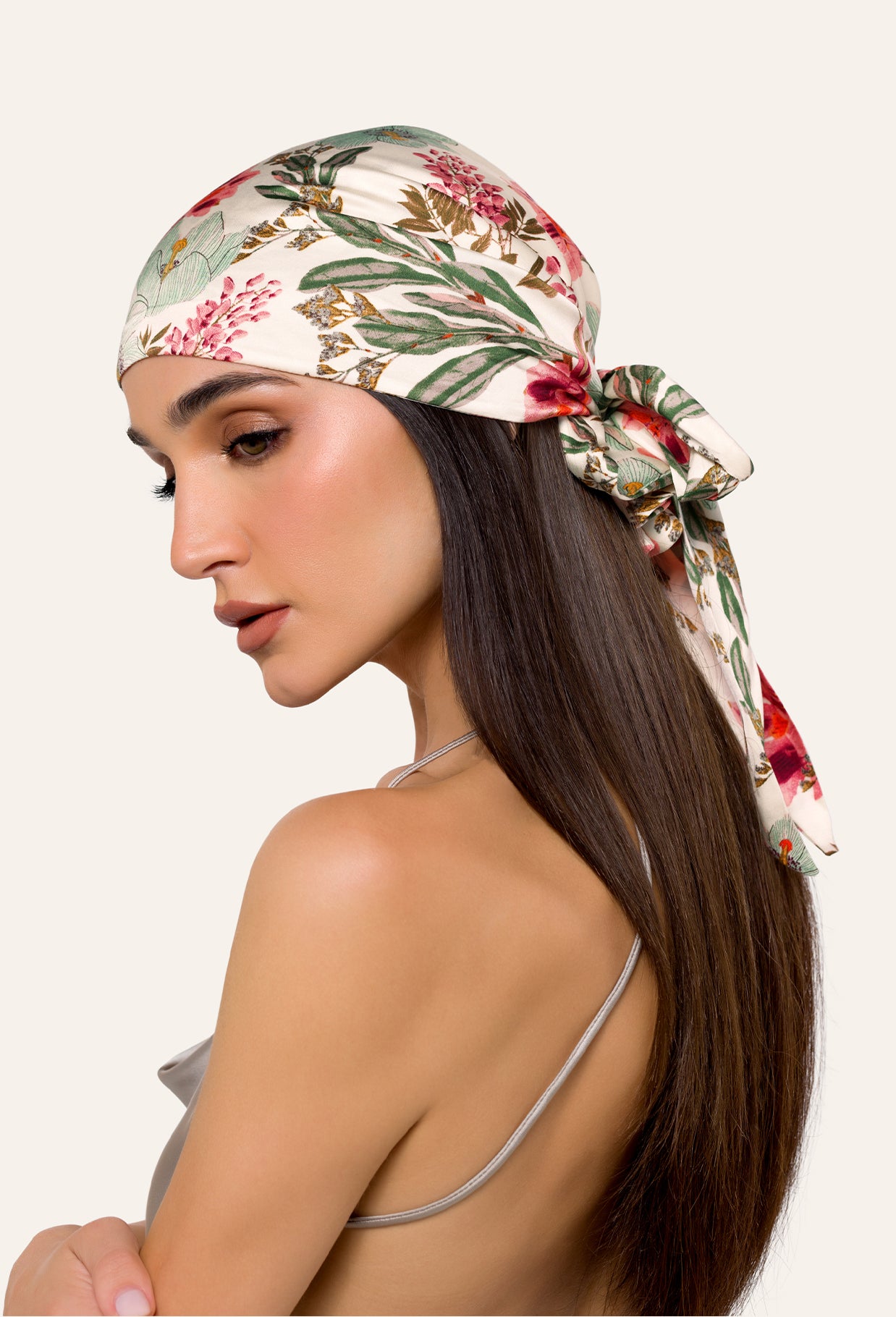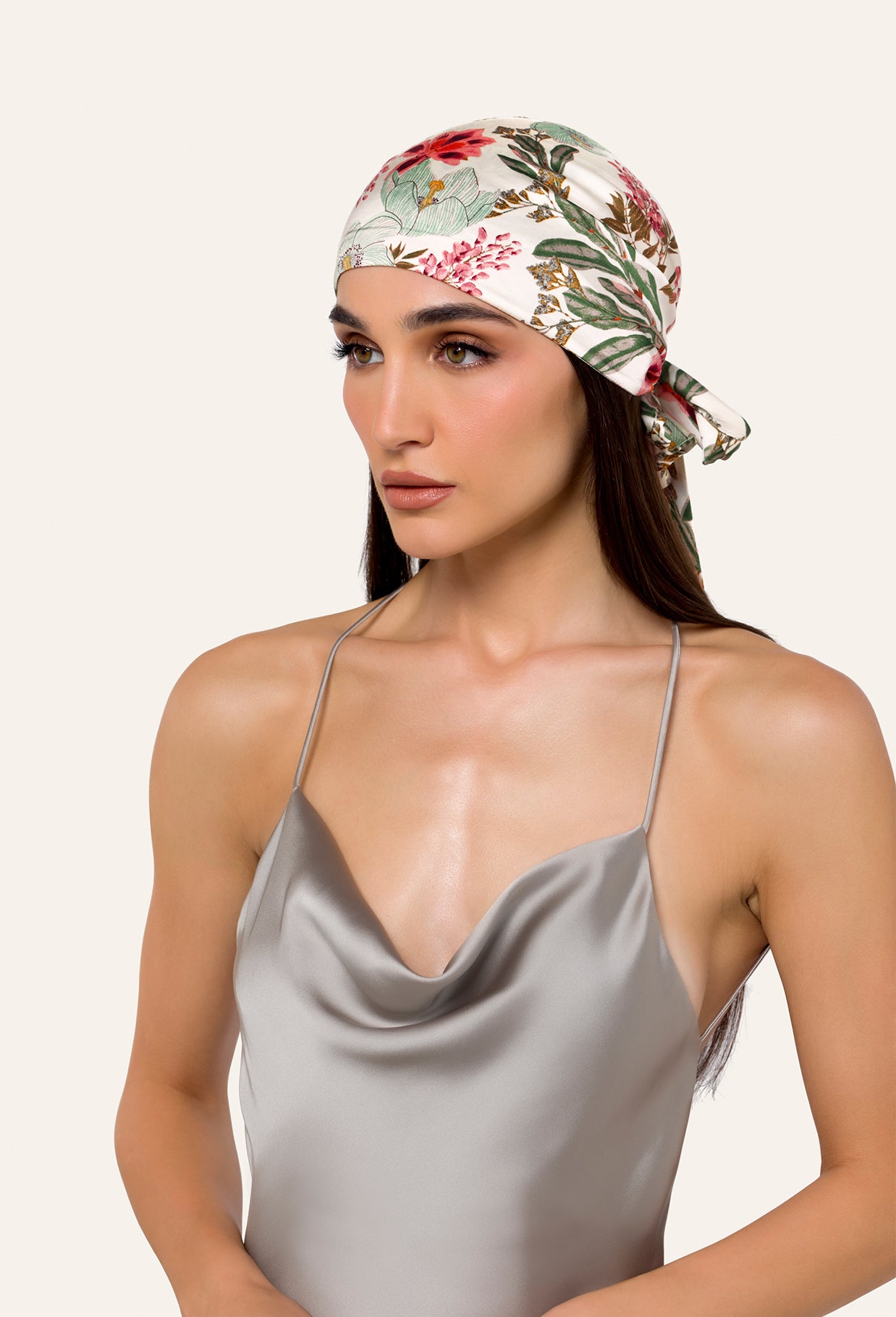 Influenced by the floral heritage of Damascus, Epitome gravitates to HEAVEN's painterly blooms in muted reds and soft sage. This bandana is cut from sumptuously soft silk and handrolled around the edges, which lends an elegant drape to the motif.