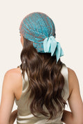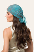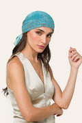 Travel is a major inspiration for Epitome, as showcased in Leena. This vibrant bandana is handmade in Italy for a non-slip fit and embellished with gilded, aqua-toned sequins reminiscent of long-lost treasures from the sea.