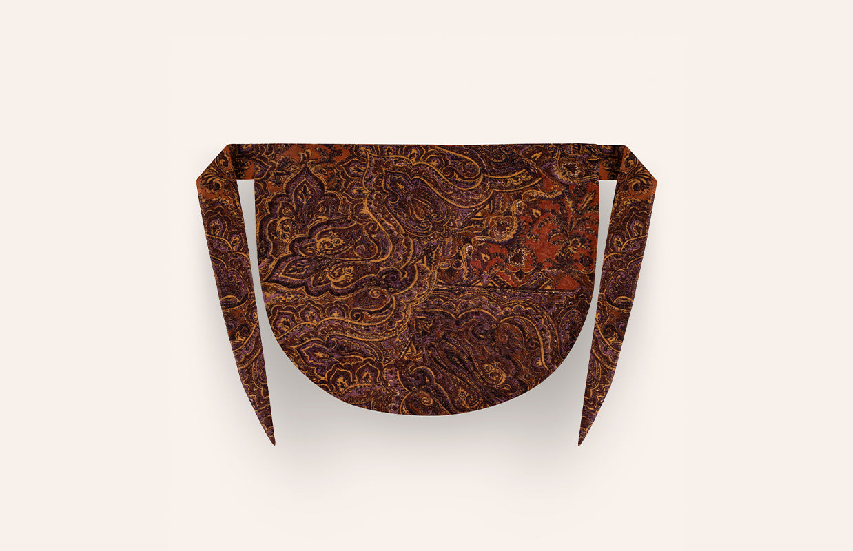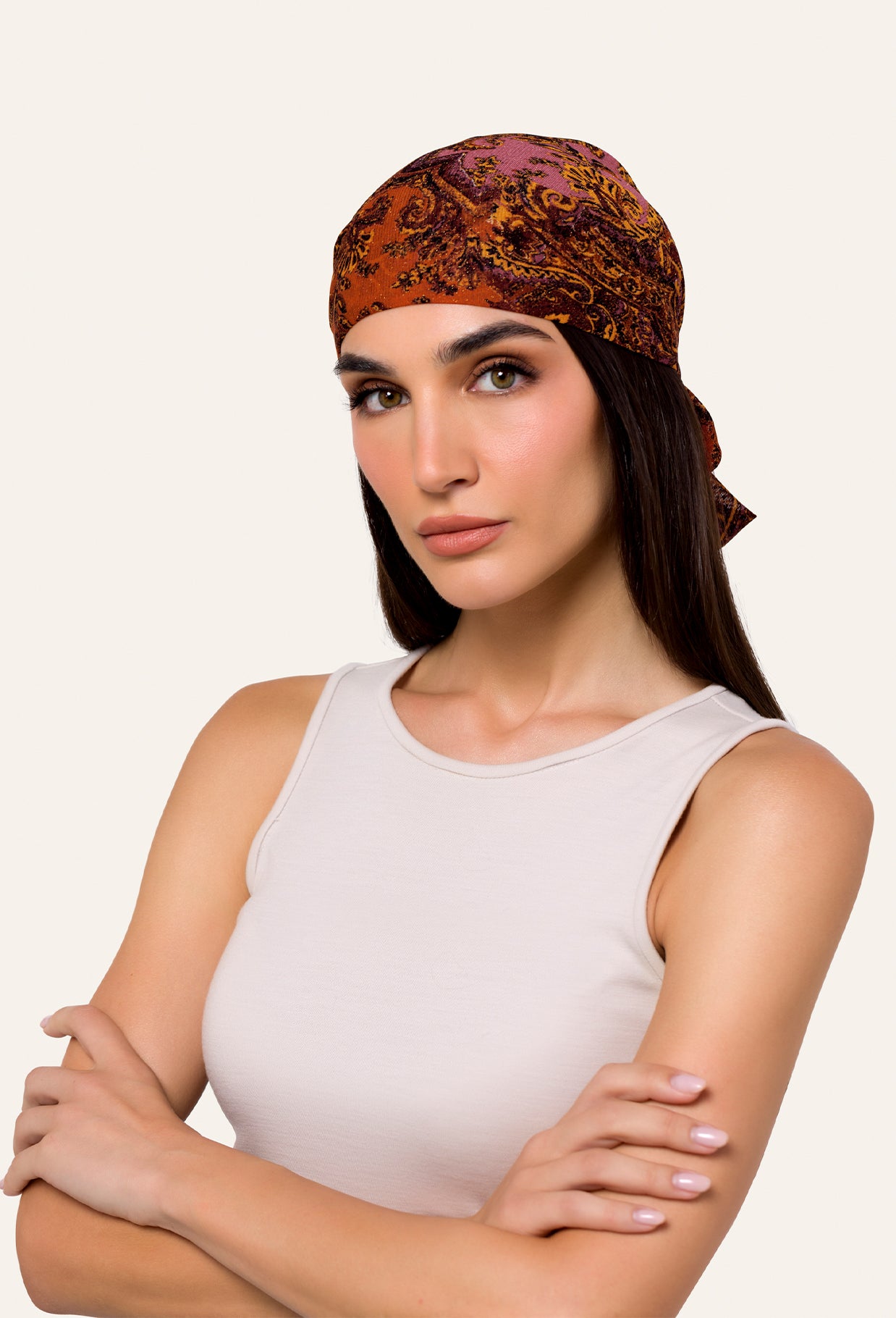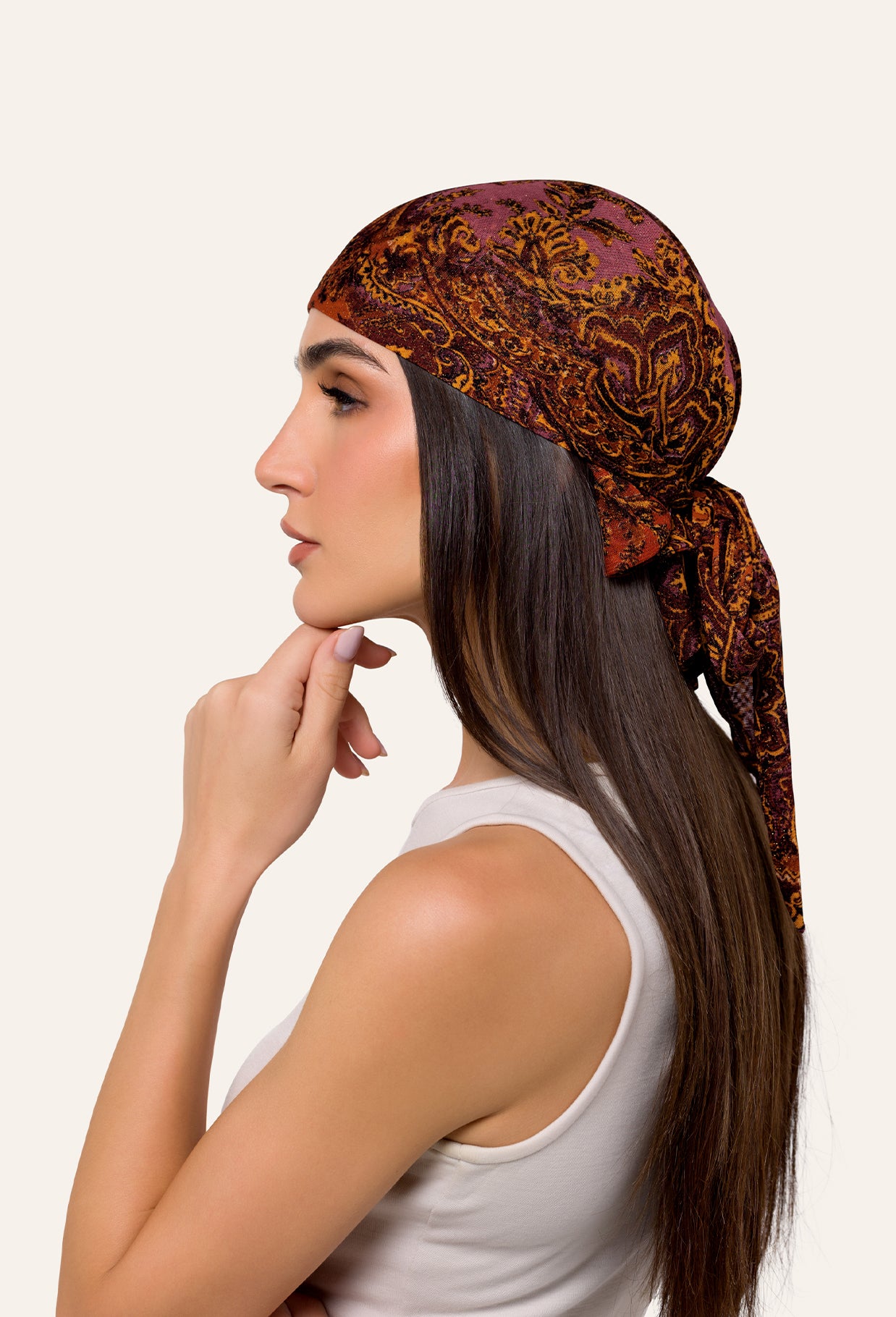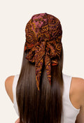Reflecting a free-spirited personality, AMELIA offers endless versatility and creativity. This lightweight chiffon bandana features a paisley motif in rich, toasted tones and an artisanally crafted fit and drape