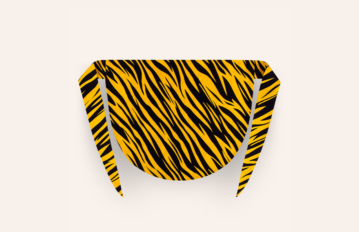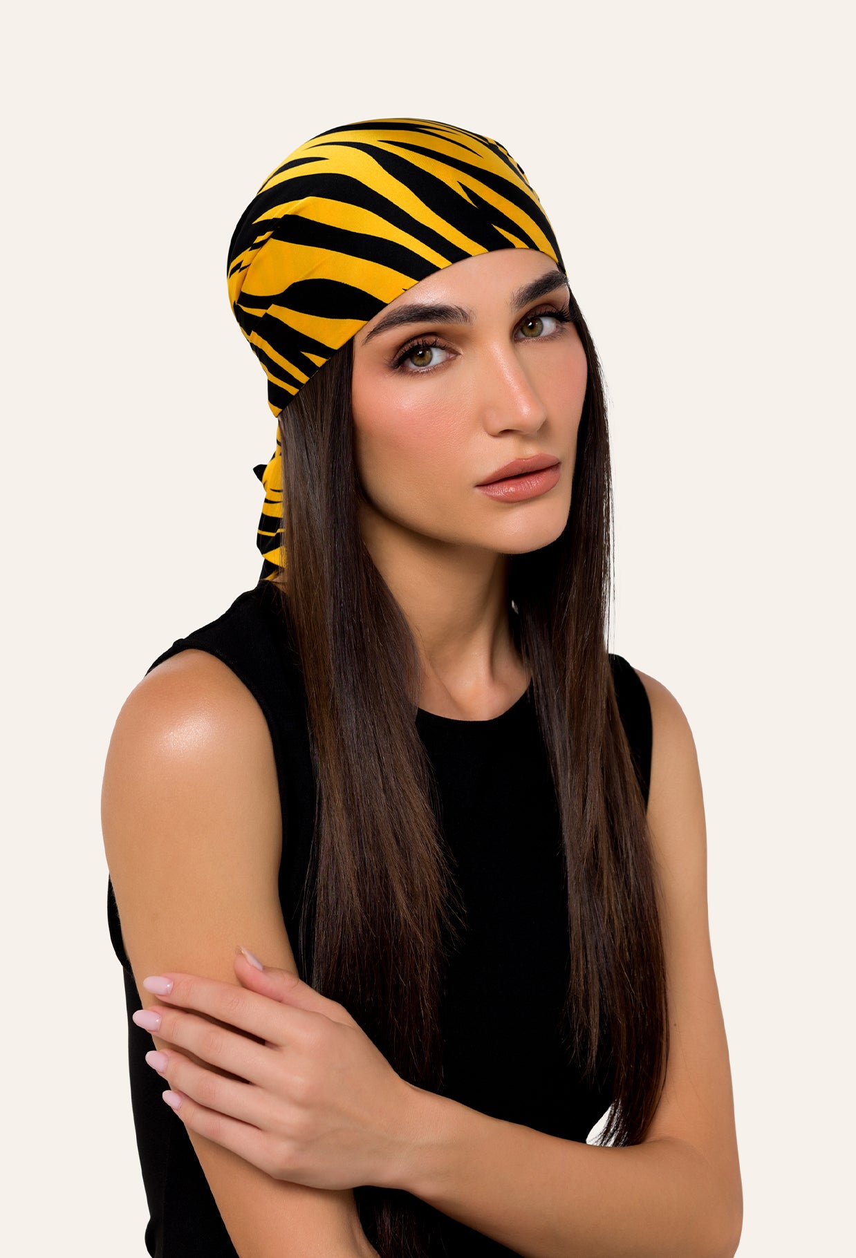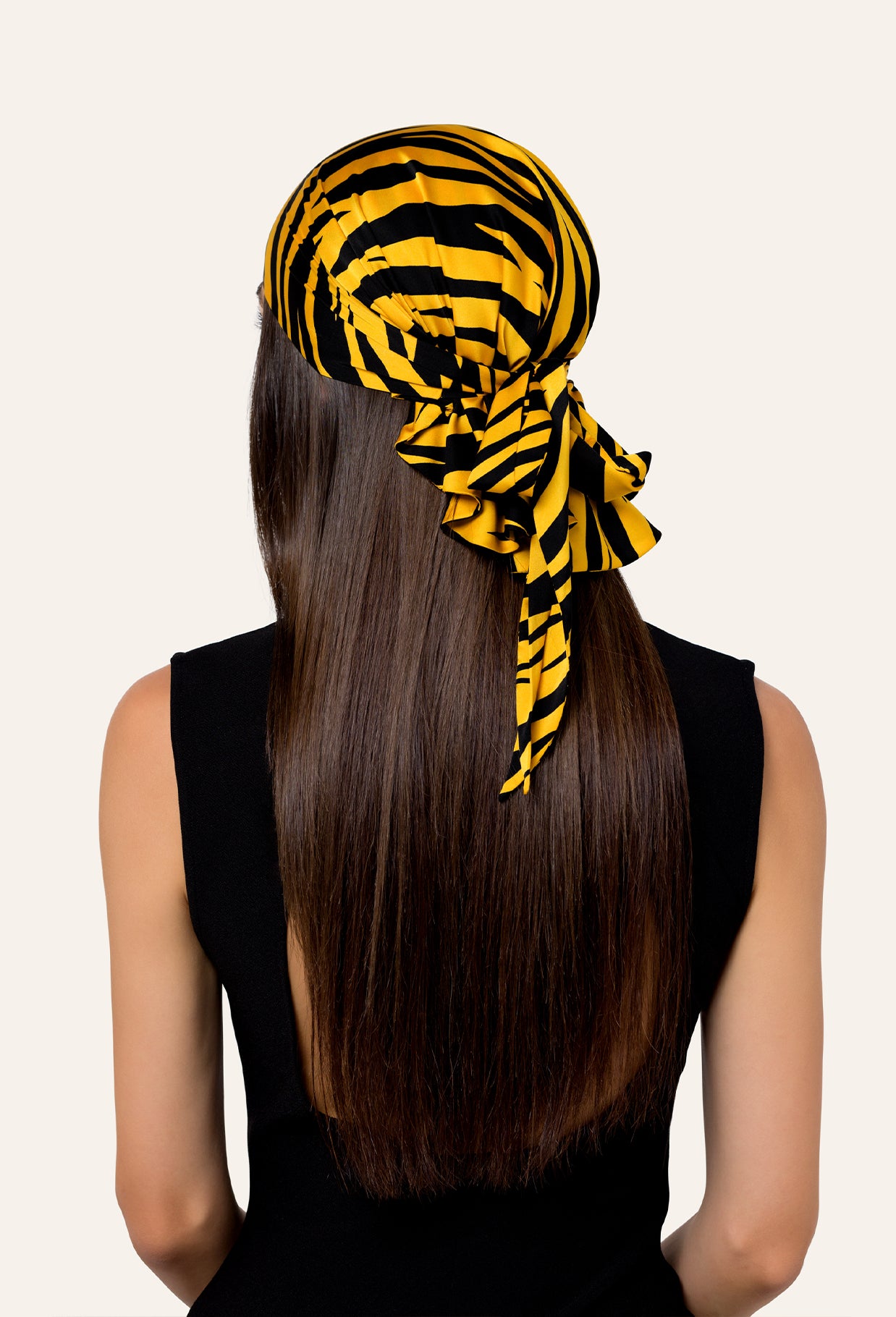 Eternally modern and versatile, MAIVE is patterned with a golden zebra motif in smooth, luxe satin. The fit has been enhanced to easily wrap and drape from the head.