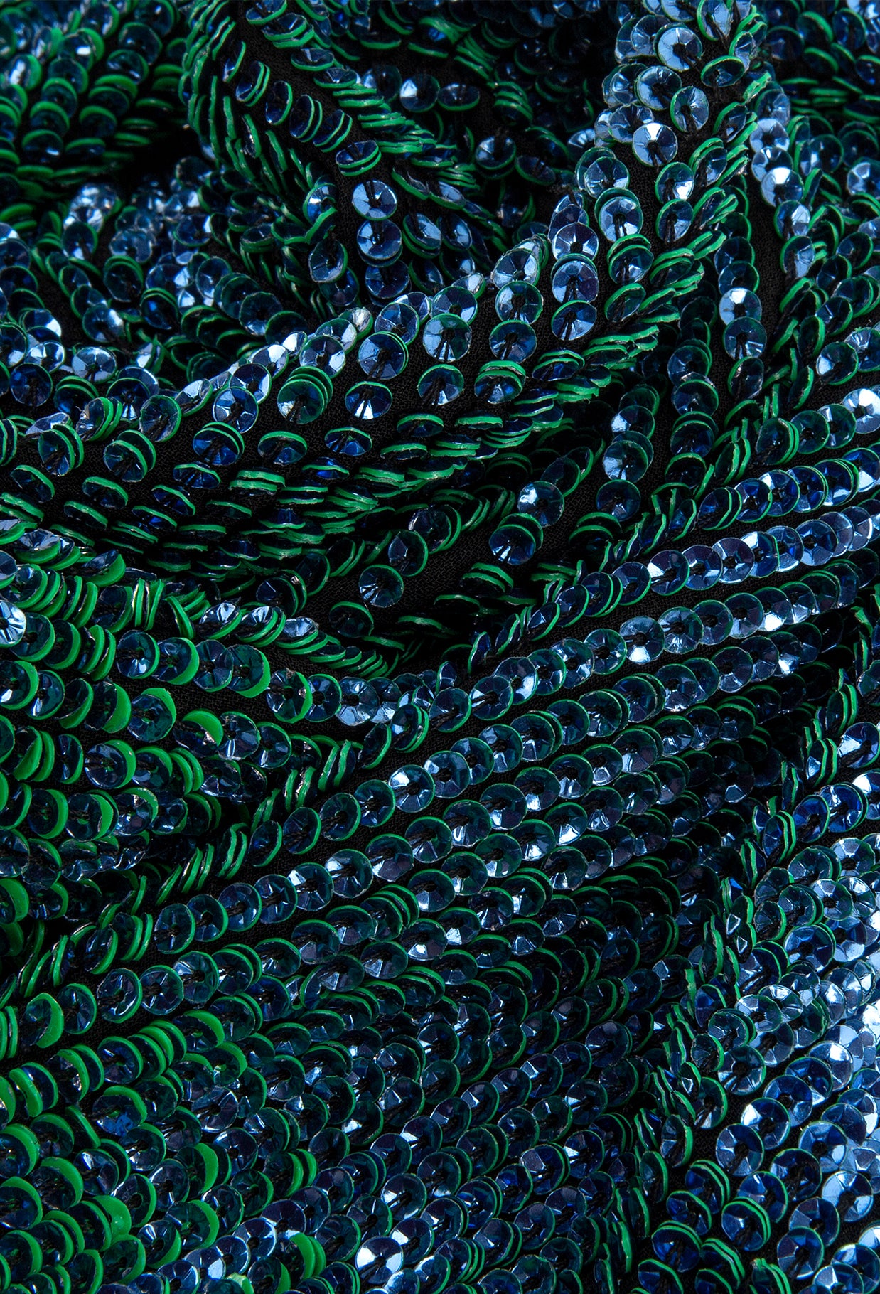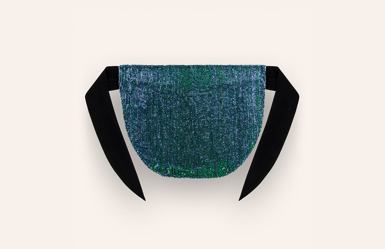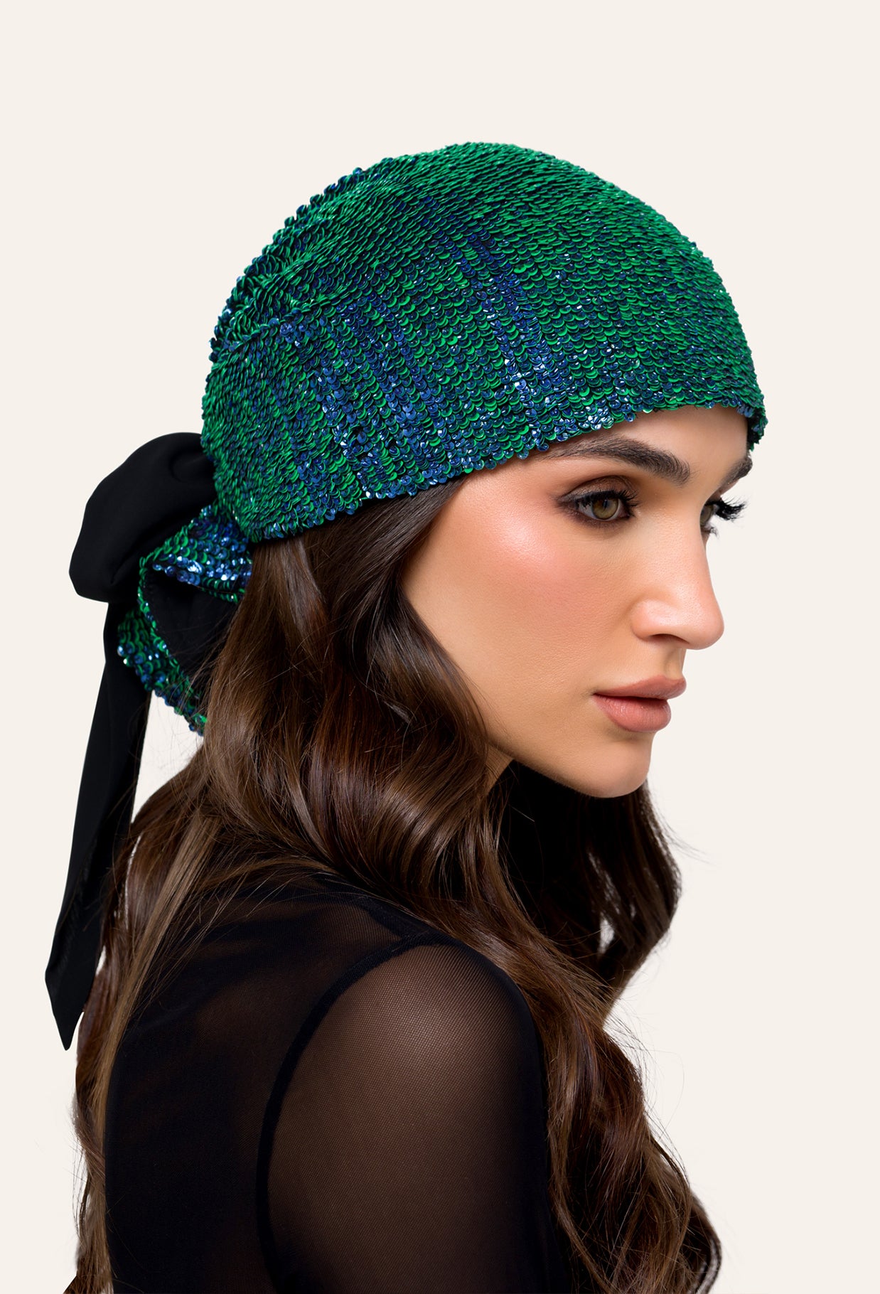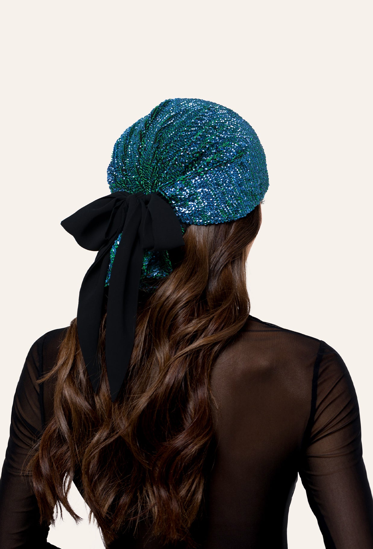 A head-turning statement. Aptly named to reference the majestic bird, The Peacock is embellished with gradient teal sequins that beautifully catch light with every move. The form and fit have been enhanced to flatter the shape of the head.