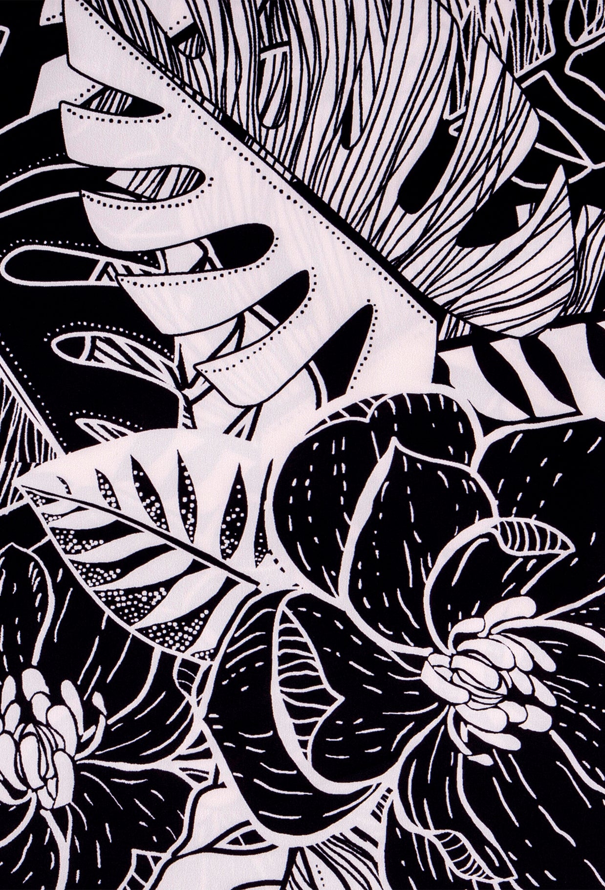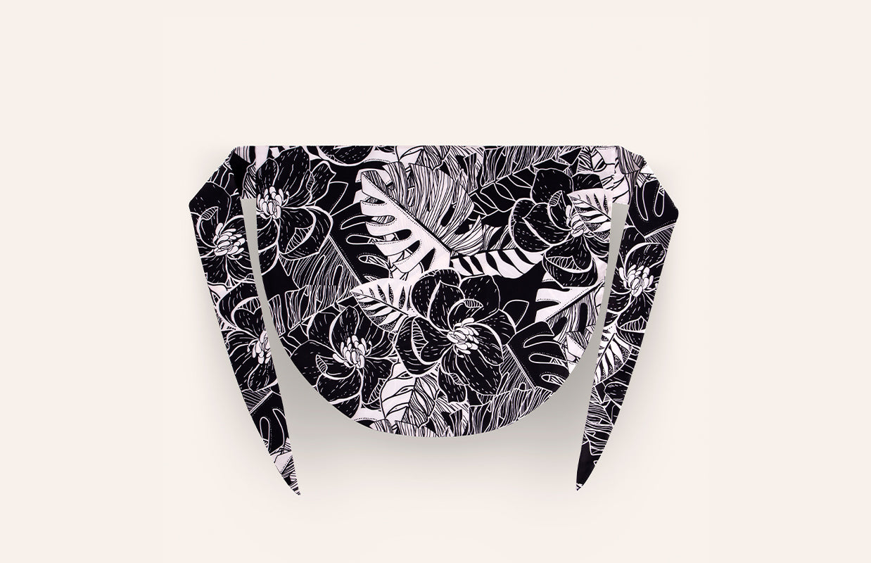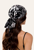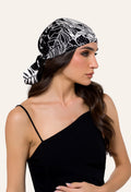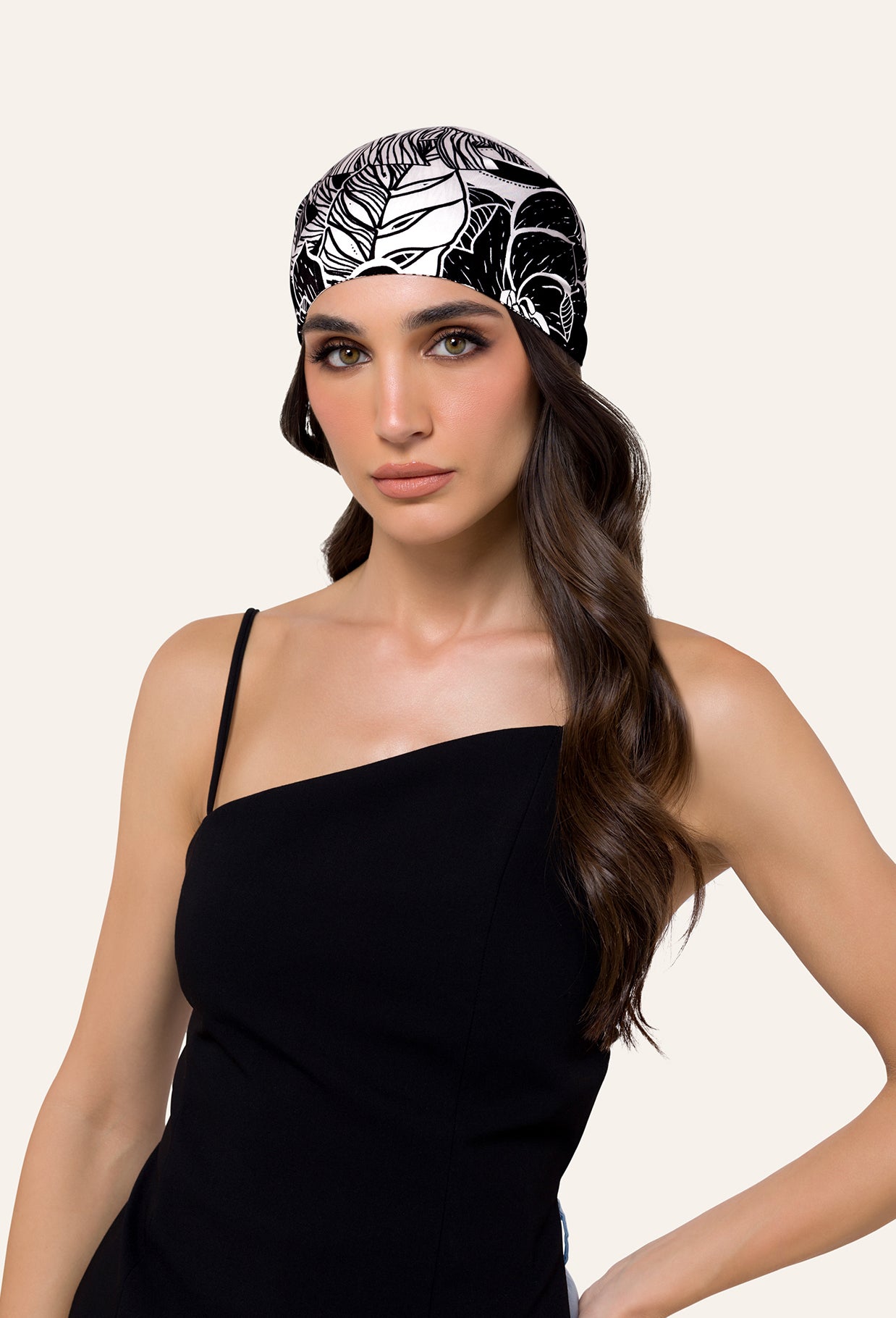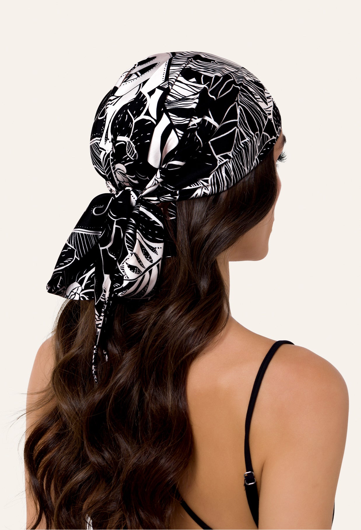 SELENE reimagines tropical motifs in an elegant monochromatic palette. Cut from sumptuous satin, this bandana features handrolled edges and beautifully shapes the head.